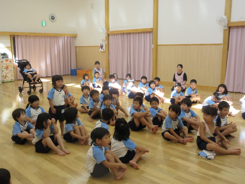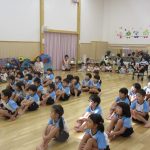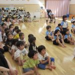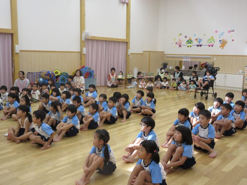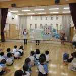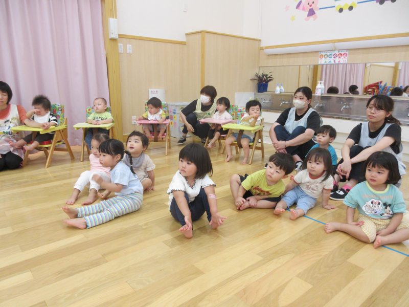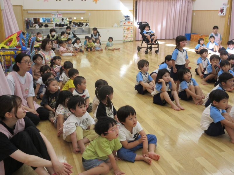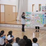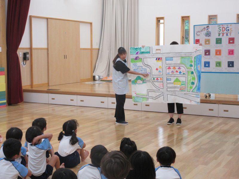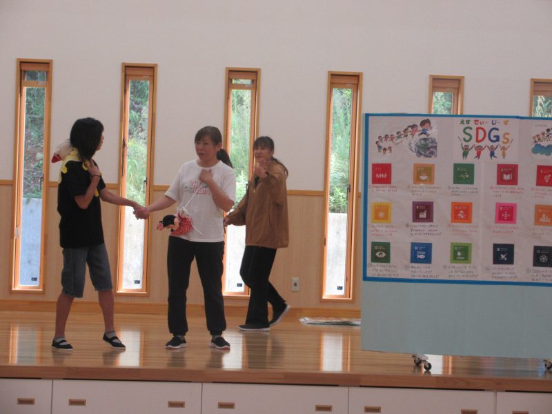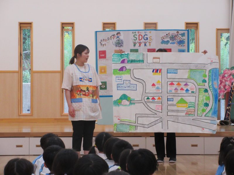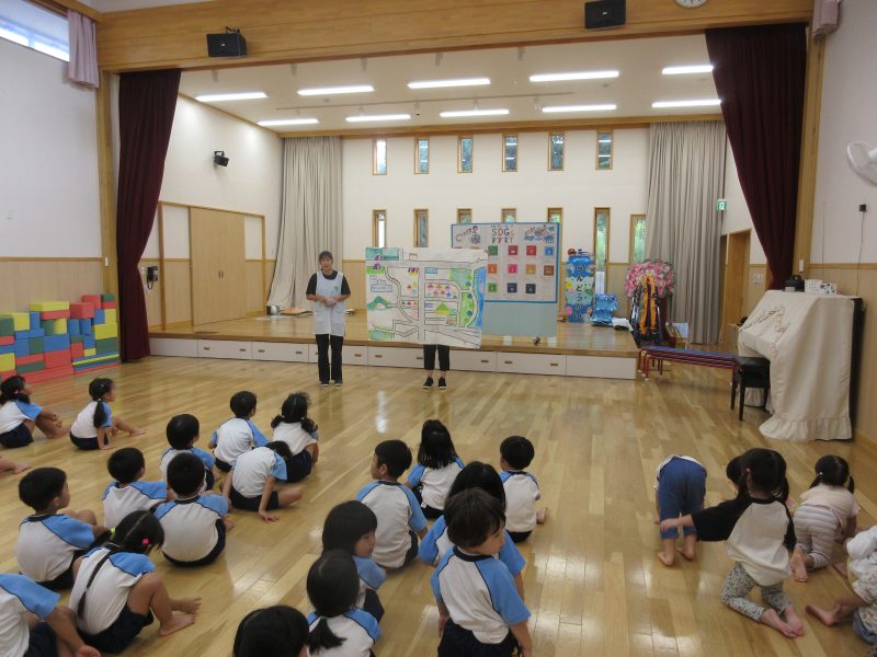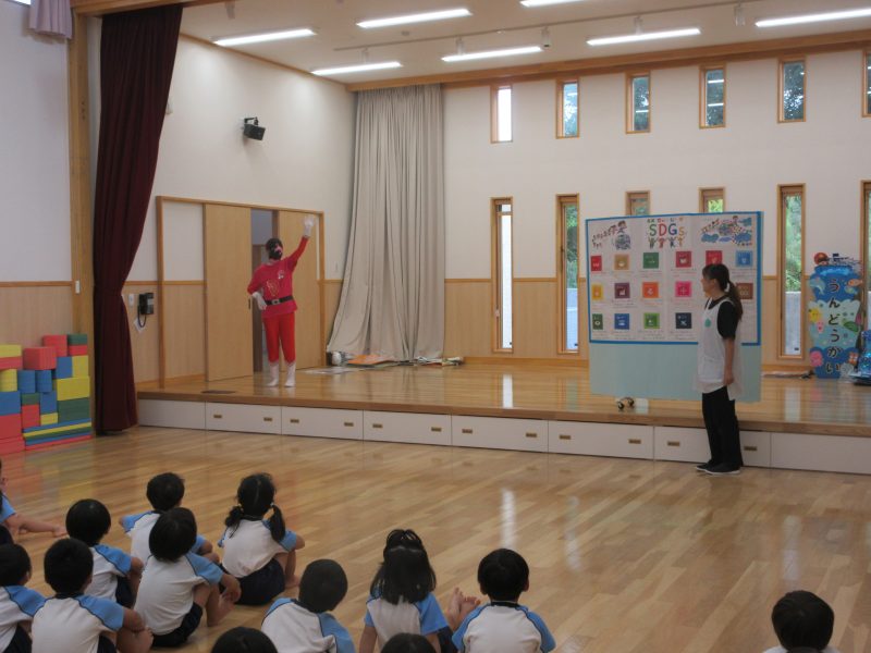 そんなことを考えながら、恒例のSDGsレンジャー出動劇を見ました。お散歩してたら地域の人が挨拶してきたよ。でも顔は見たことあるけど知らないから挨拶しな~い!の子ども達。そこへDマン登場‼地域の人々とは、仲良くしていこうね❤地域の人々と関わりを持つことで助けてくれることもあるよ!と、教えてもらいました。