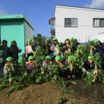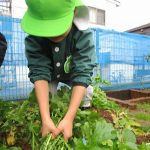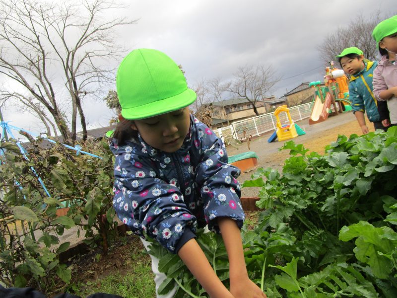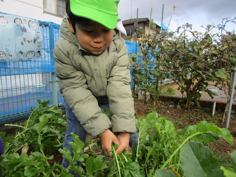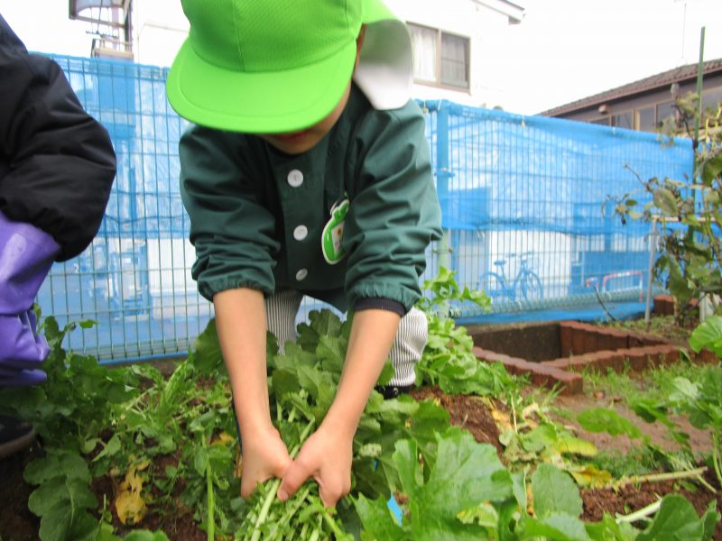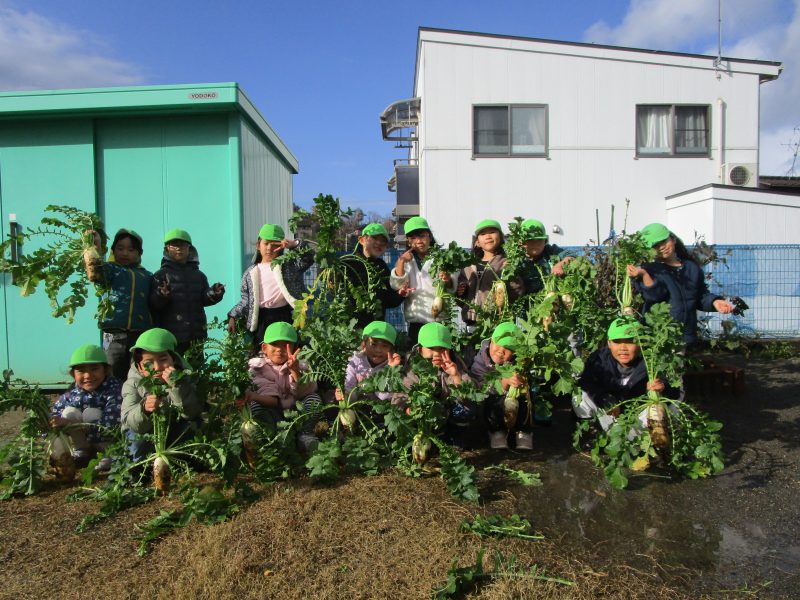 大根を抜いてみると、「やったー大きい大根だ」や「あれ?葉っぱは大きいのに大根小さかった」と様々な大きさの大根にびっくりしていた子どもたちでした!!みんなであっという間大根を収穫しました!