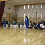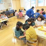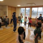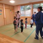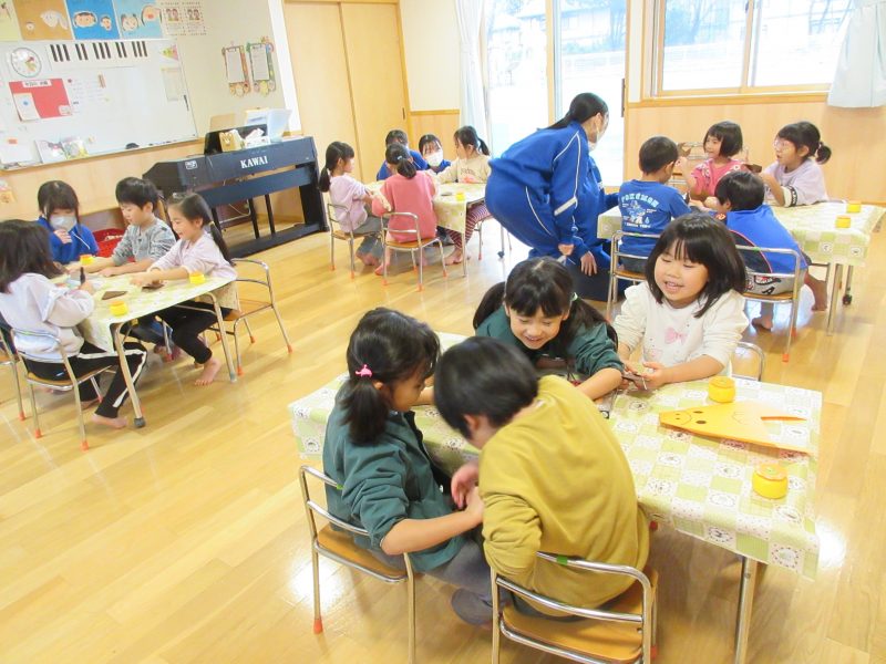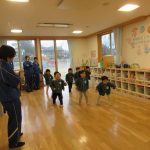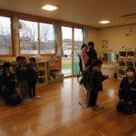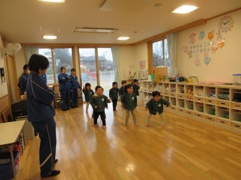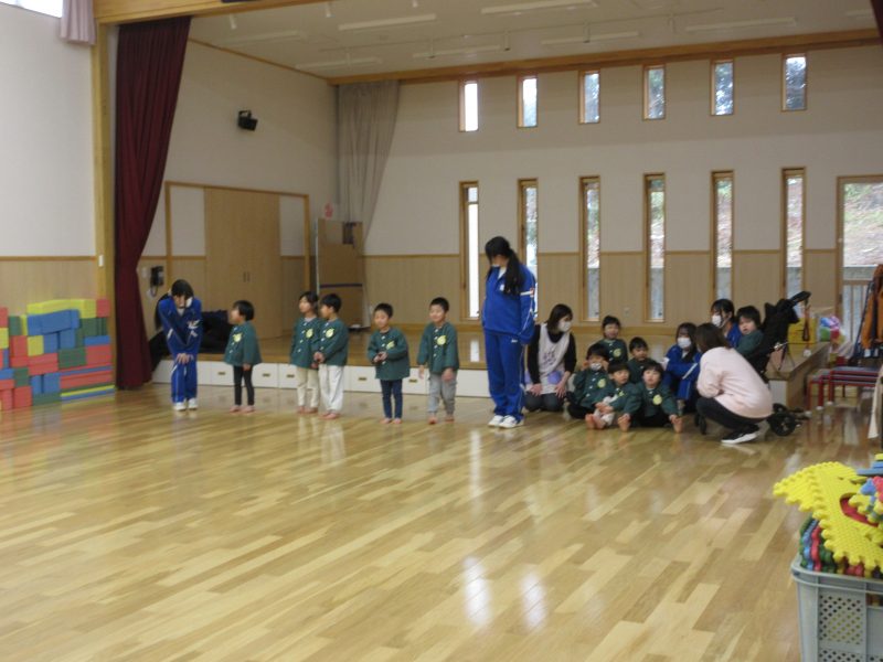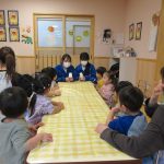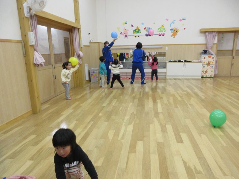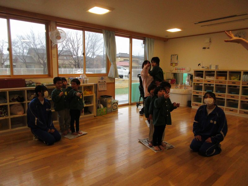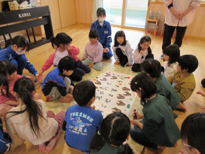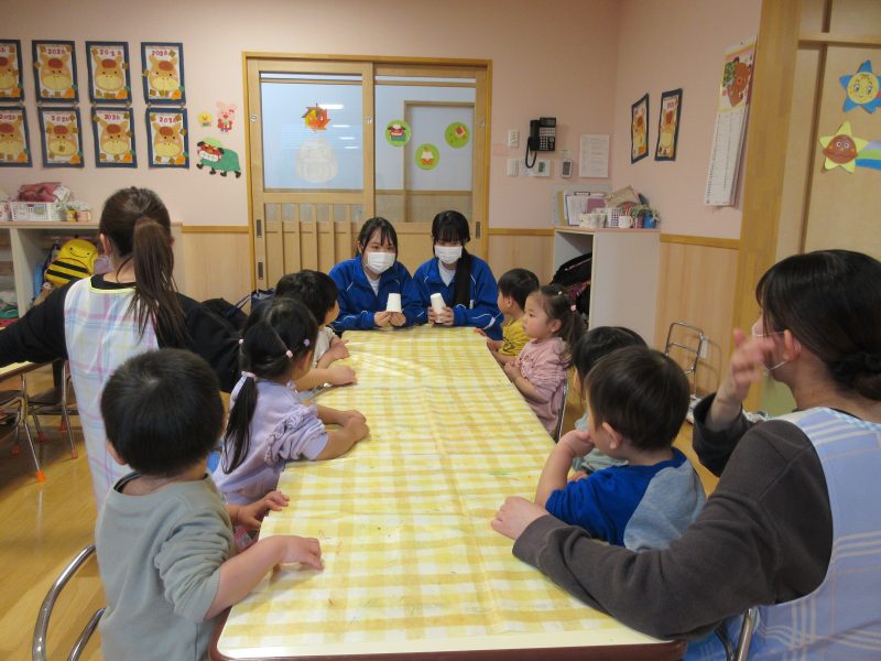 1月14日(水)総合高校生が保育園に遊びに来てくれました。“だるまさんがころんだ”“新聞紙を使ったじゃんけんゲーム”“折り紙”“けん玉”“じゃんけん列車”などお姉さんお兄さんに教えてもらいながら一緒に遊びました。抱っこをしてもらったり、手をつないでもらったり・・子どもたちはニコニコでした!