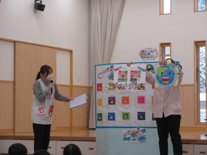 2月2日(月) 今年度最後のSDGs集会。地球を守るための世界のみんなの目標だということを、1番~17番の順番におさらいしました。