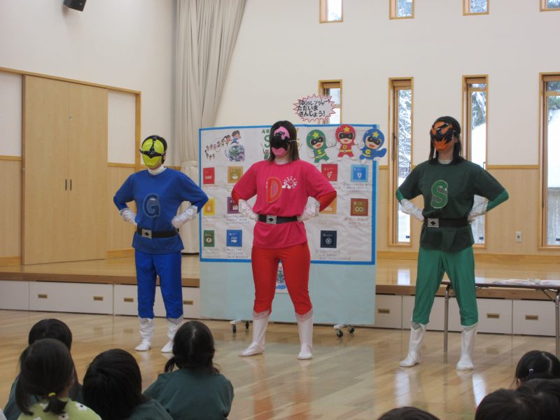 そしてお待ちかねのSマンDマンGマンの登場‼SDGsマンのいつもの活躍を教えてもらい、その後は子どもたちにもSDGsで頑張ってきたことを発表してもらいました!