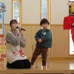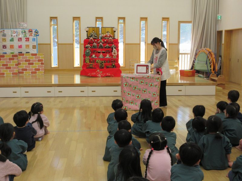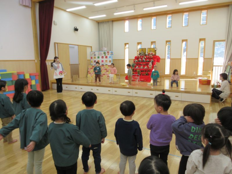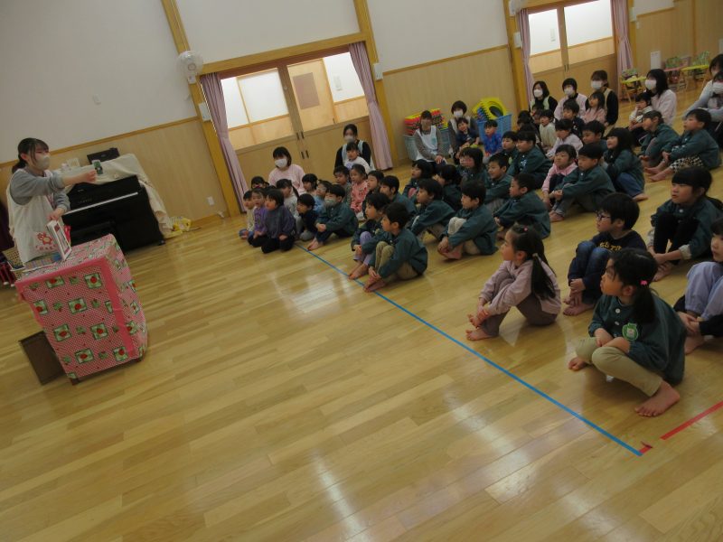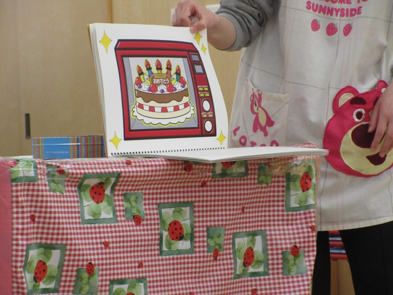 今月のお楽しみシアターは“ミラクルレンジ”でした。レンジに材料を入れて魔法の言葉を唱えるとお料理ができるお話でした。エビマヨおにぎりやホットドックやフライドポテトが出来たり・・・最後は、イチゴのケーキの出来上がり🎂2月生まれのお友だちおめでとう💕