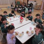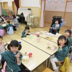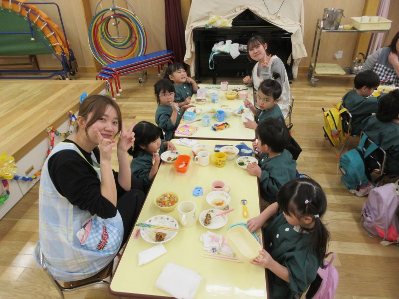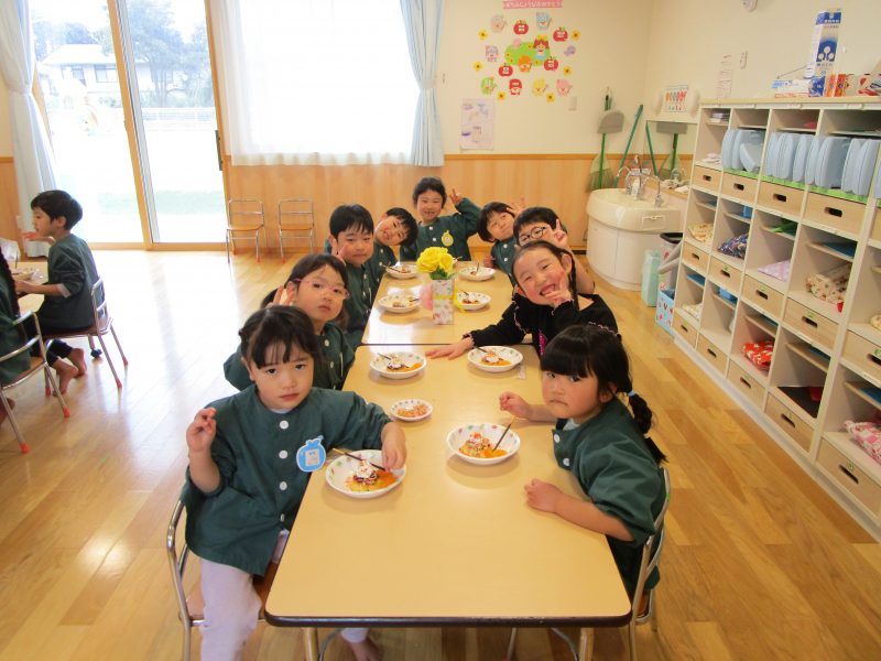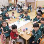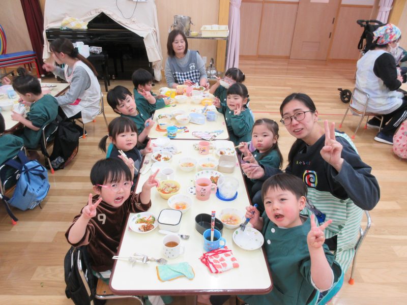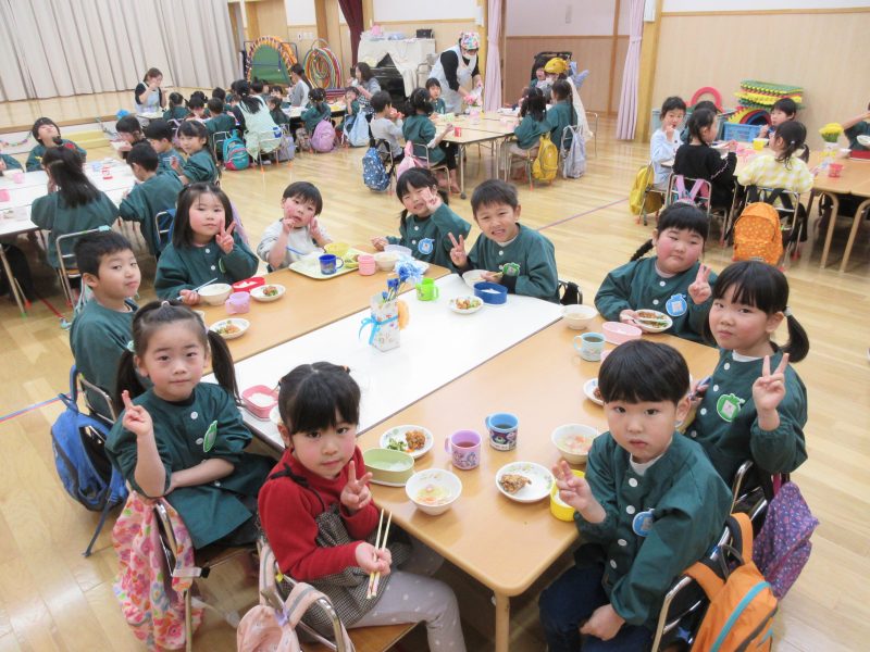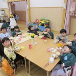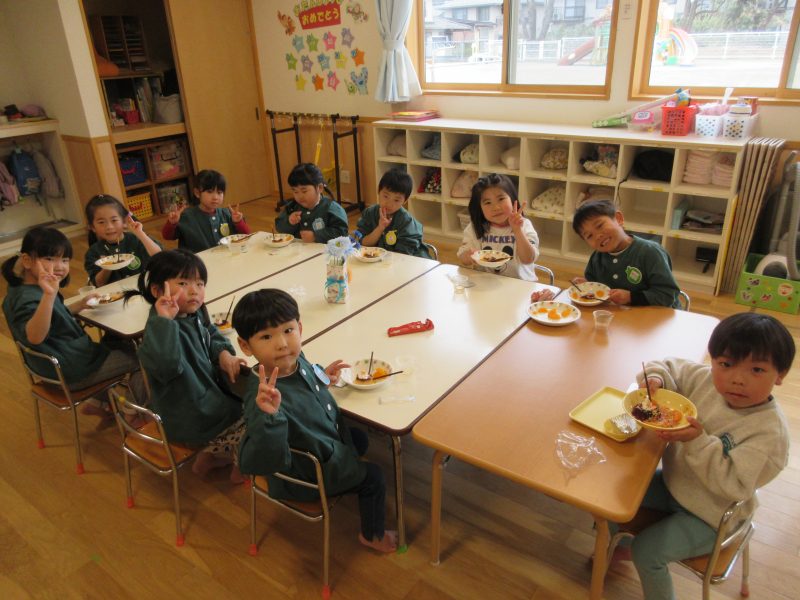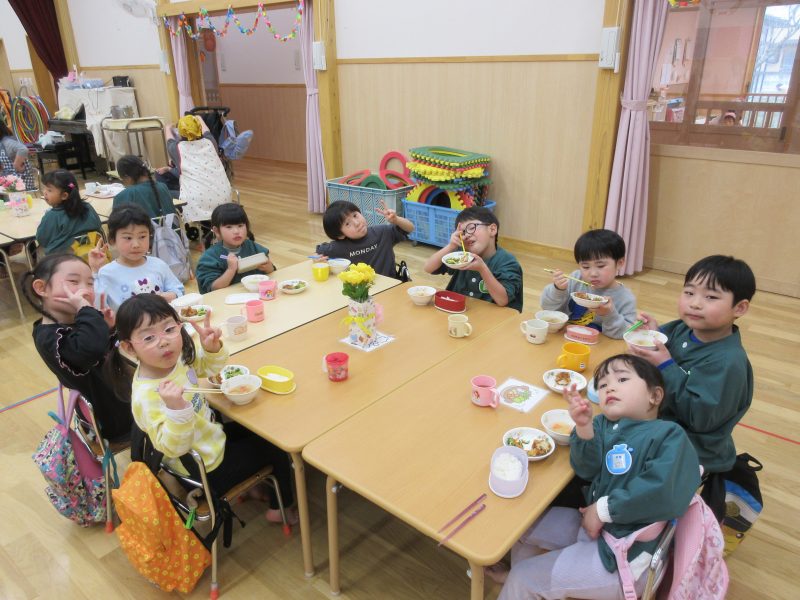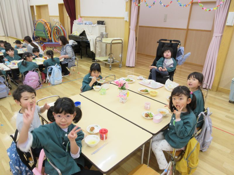 給食は遊戯室で会食をしました。縦割りチームで分かれてみんなで楽しくお話しながらおいしい給食の時間を楽しみました。うさぎ組は初めての会食😊いつもと違う場所でみんなで食べる給食おいしかったね!