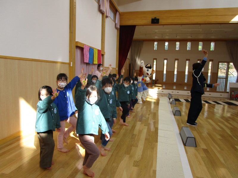 3月7日(火)、5歳児のみんなで交通安全教室に参加しました。歩道を歩く時のお約束や横断歩道の渡り方などを、猫のミーちゃんと一緒に聞きました!!お話を聞いた後は、実際にランドセルを担いで歩く練習!!「右を見て!左を見て!もう一度右を見て!」みんな上手に横断歩道を渡ることができました✨