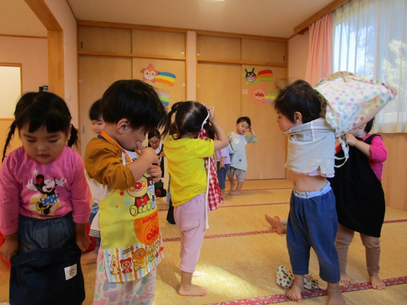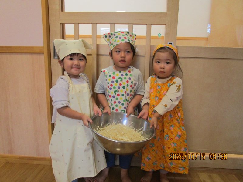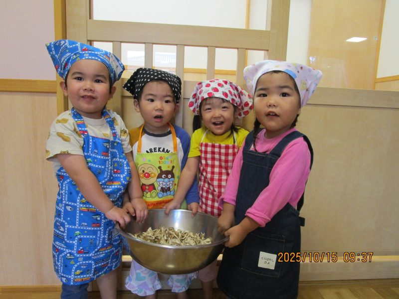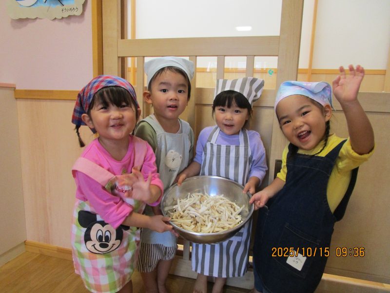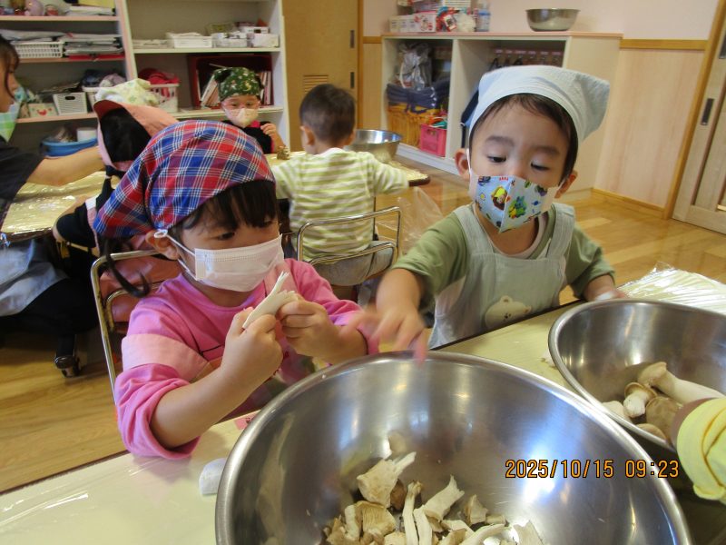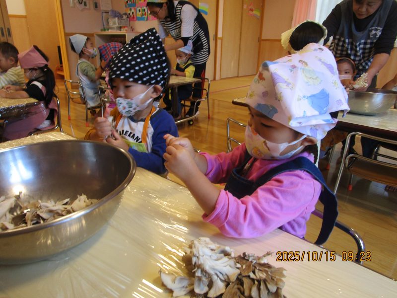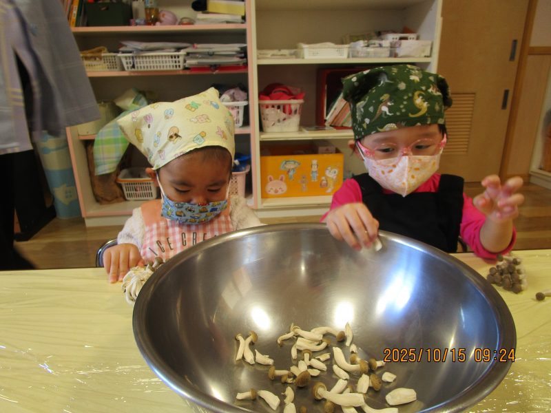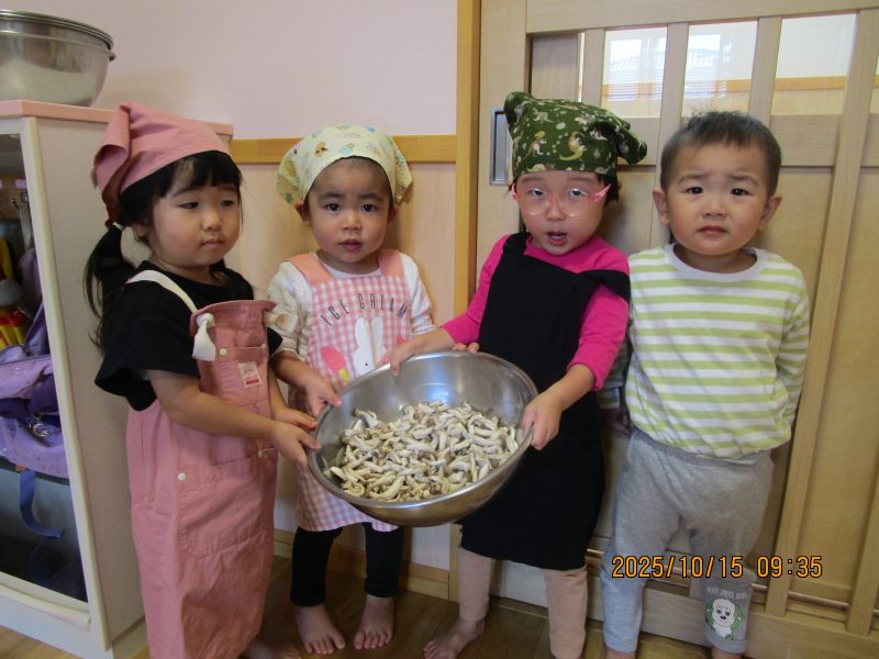10月15日(水)にうさぎ組がきのこさきをしました🍄エリンギ、えのき、まいたけ、しめじの4種類のきのこの色や形の違いを見て早速スタート!きのこの種類によって、ちぎりやすいきのこ、ポロポロ取れるきのこ、ちぎるのが難しいきのこなどがありました😆「今日はきのこ触ってもいいの~?」「なんかちょっとくさ~い😆」「鳥の羽みたいでパタパタきのこだね~」と楽しんでいた子どもたちです🥰🍄みんながちぎってくれたきのこは、給食できのこ汁として登場!「僕のきのこあった~!」と喜んでモリモリ食べていました🍄美味しかったね😋✨そして、今回はエプロンや三角巾など、自分で畳むことにチャレンジ!「どうやってするの~?」「これでいいの~?」と頑張っていた子どもたちです😊エプロンなどの用意、ありがとうございました✨