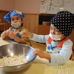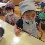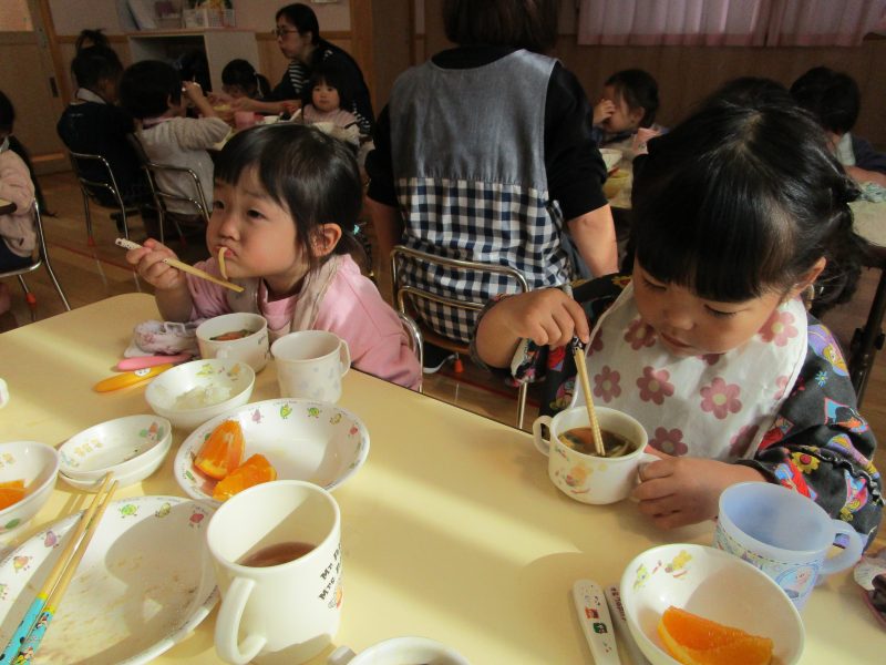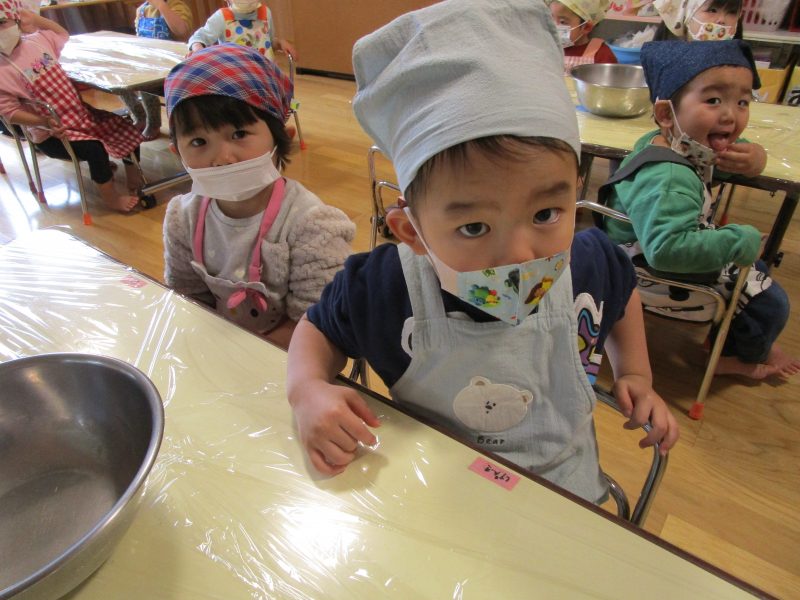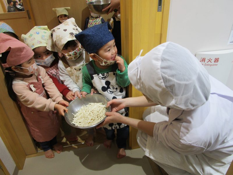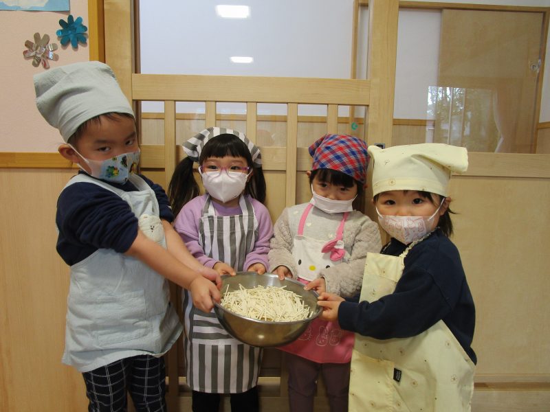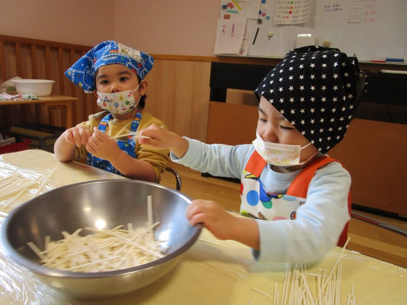 1月15日(木)にうさぎ組がうどん折りをしました!前日の帰りの会で「明日はうどん折りがあるよ」と伝えると、「びよ~んってするのか?」「ぺったんぺったんじゃない?」といろいろな想像をしていた子どもたち😆実際にうどんが登場すると、「あれ⁉かたーい!」「カチカチ音がするよ!」と硬いうどんにびっくりした様子でした😲✨食べやすい大きさにぽきぽき折って完成‼みんなが折ってくれたうどんは、給食でカレーうどん汁に変身😋❤「モチモチ、つるつるになってるね❤」と喜んで食べていました!そして今回も自分でエプロンなどを畳みました!前回よりもさらに上手になっていた子どもたちです🥰エプロンなどの用意、ありがとうございました✨